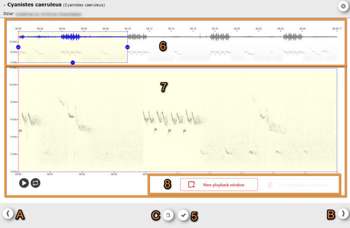 Clicking on New playback window will immediately show a new red framed box on the detailed sonogram area (see image below). Note the the full sonogram at the top (number 6 in image Sound player general view) also contains the red boxes.
