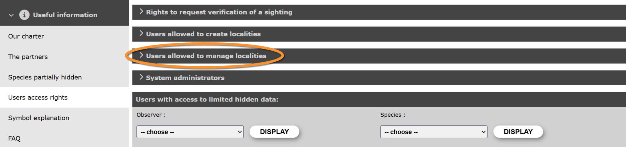 · In ornitho.de, ornitho.at and onrnitho.it it gives access to Content categories. All other portals get access to Content categories with Content page admin rights.