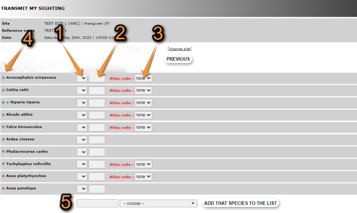 - Menu > Taking part > Transmit my sighting > Choosing from > "Name of the protocol" > "Site" > Add observations.