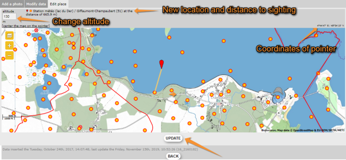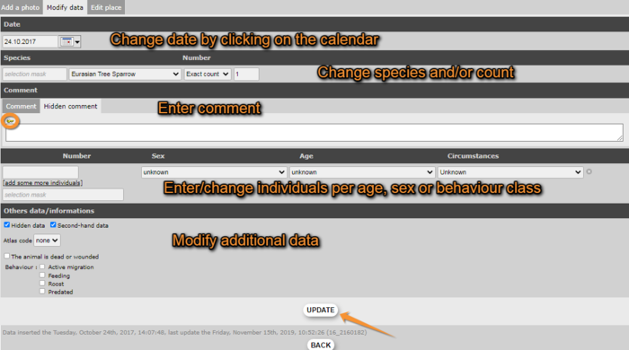 Choose tab Modify data and edit date, species, count, comments and/or additional information, except pictures and sounds, as in Web interface > Submitting records > Step 3/3: Transmit my sighting. Modify as needed and click Update at the bottom. See image Editing a simple record. Modify data.