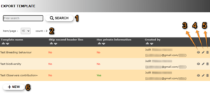 We take the example below from Explore> All my observations, the past 30 days (see image Exporting your data). Select a template (for example, BASIC) and click on the format (for example, Excel). Place the mouse pointer on the format icons to see which extension corresponds to each icon. Once you click on the format, the file is automatically generated in the format you selected. Create your own templates using the wheel next to the template expandable list. See your exports in All my exports (see image Exporting your data, creating files).