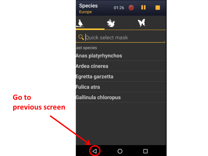 After entering an observation, you can modify the basic information you just entered by accessing the list of species in your phone. To do so, click on the list icon from the Place screen (see image) and click on the record to modify.