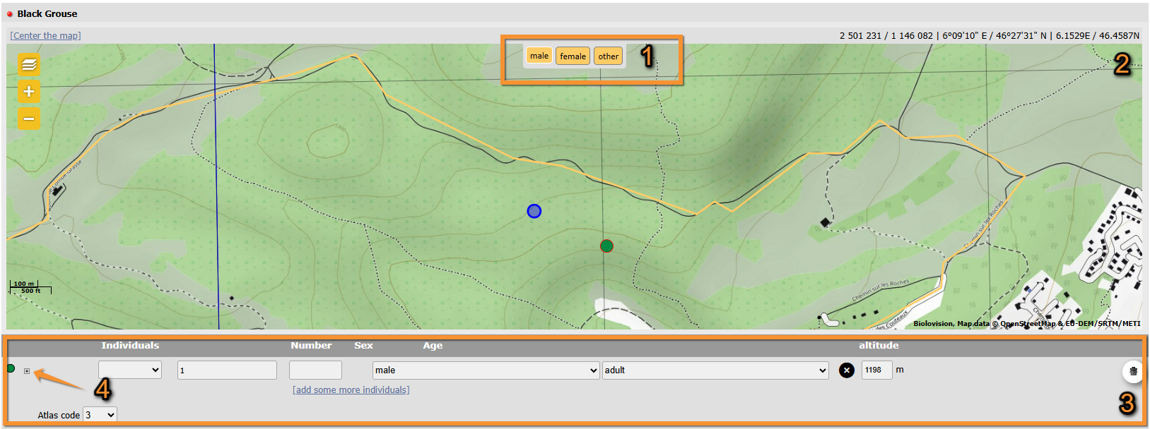 2. Position the observation on the map. Each sighting is indicated with a different point colour.