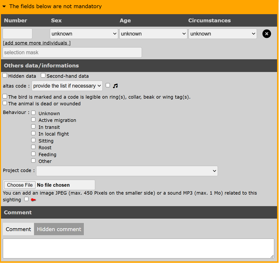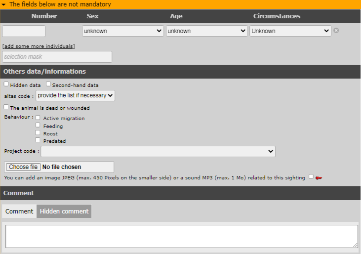 Transmitting sightings: non mandatory fields, general view.