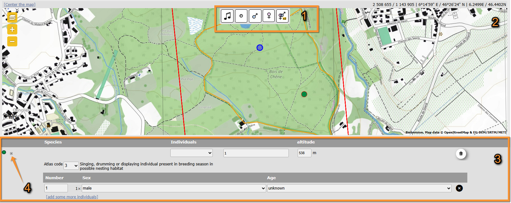 2. Position the observation on the map. Each sighting is indicated with a different point colour.