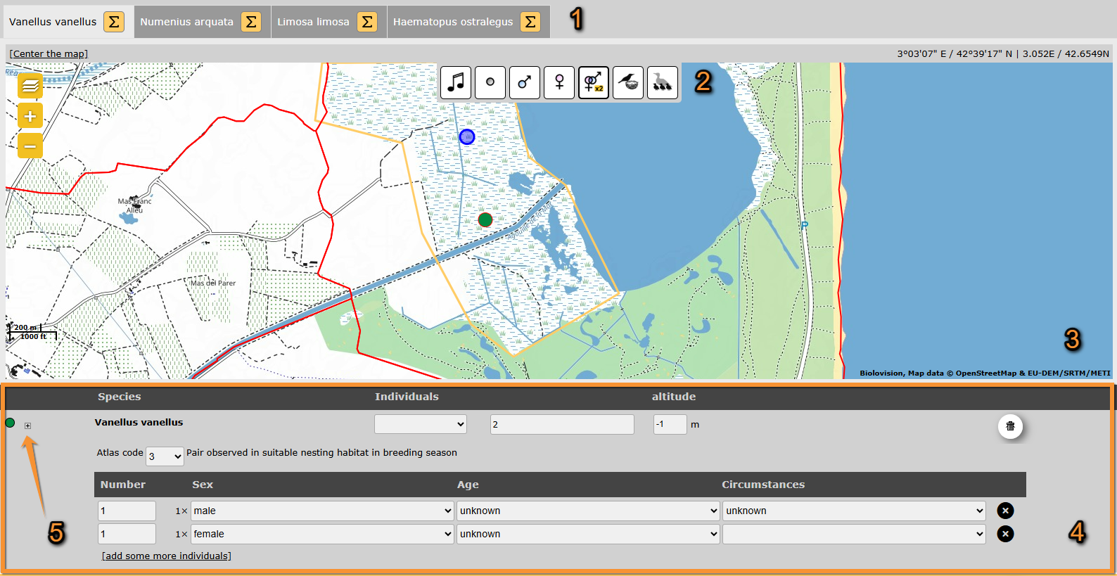 3. Position the observation on the map. Each sighting is indicated with a different point colour.