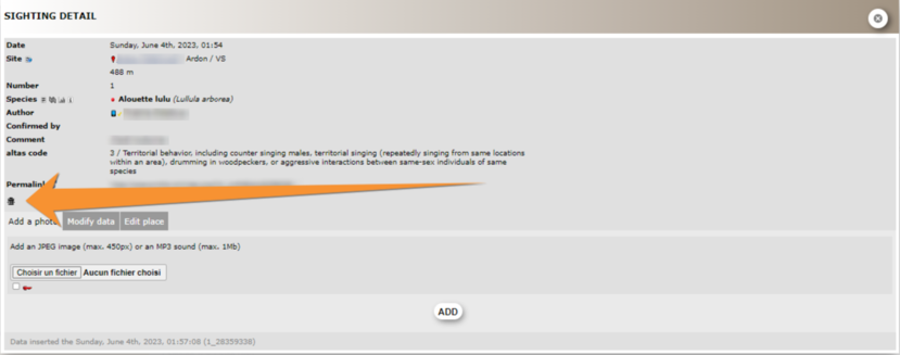 Note depending the local portal you are using, the bin may be deactivated if the data has been already exported. When it is the case, the bin does not appear and the editing symbol is in red (3 on image Bin to delete data in "All my observations").